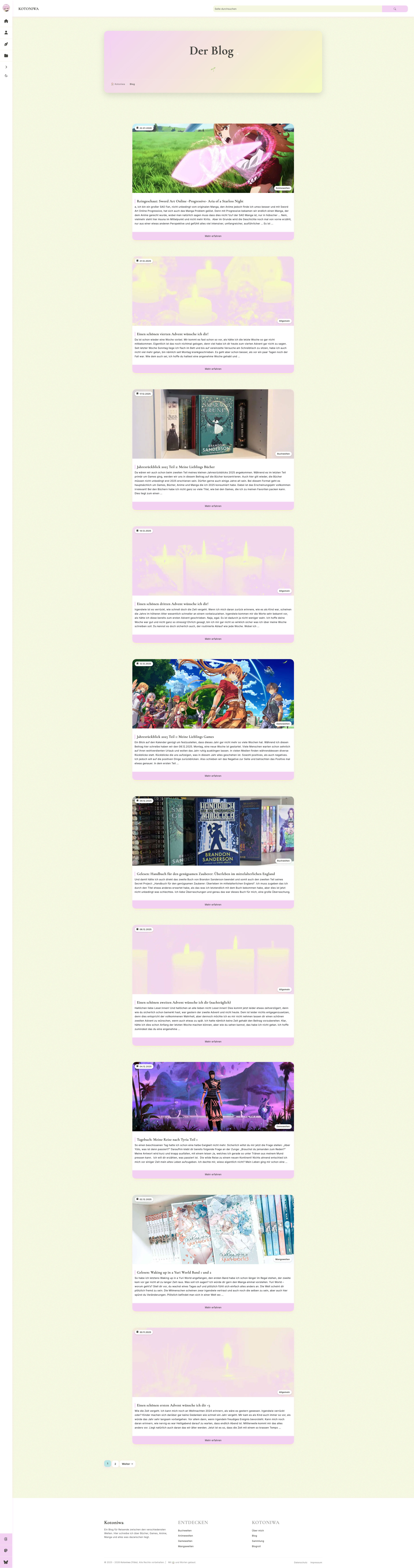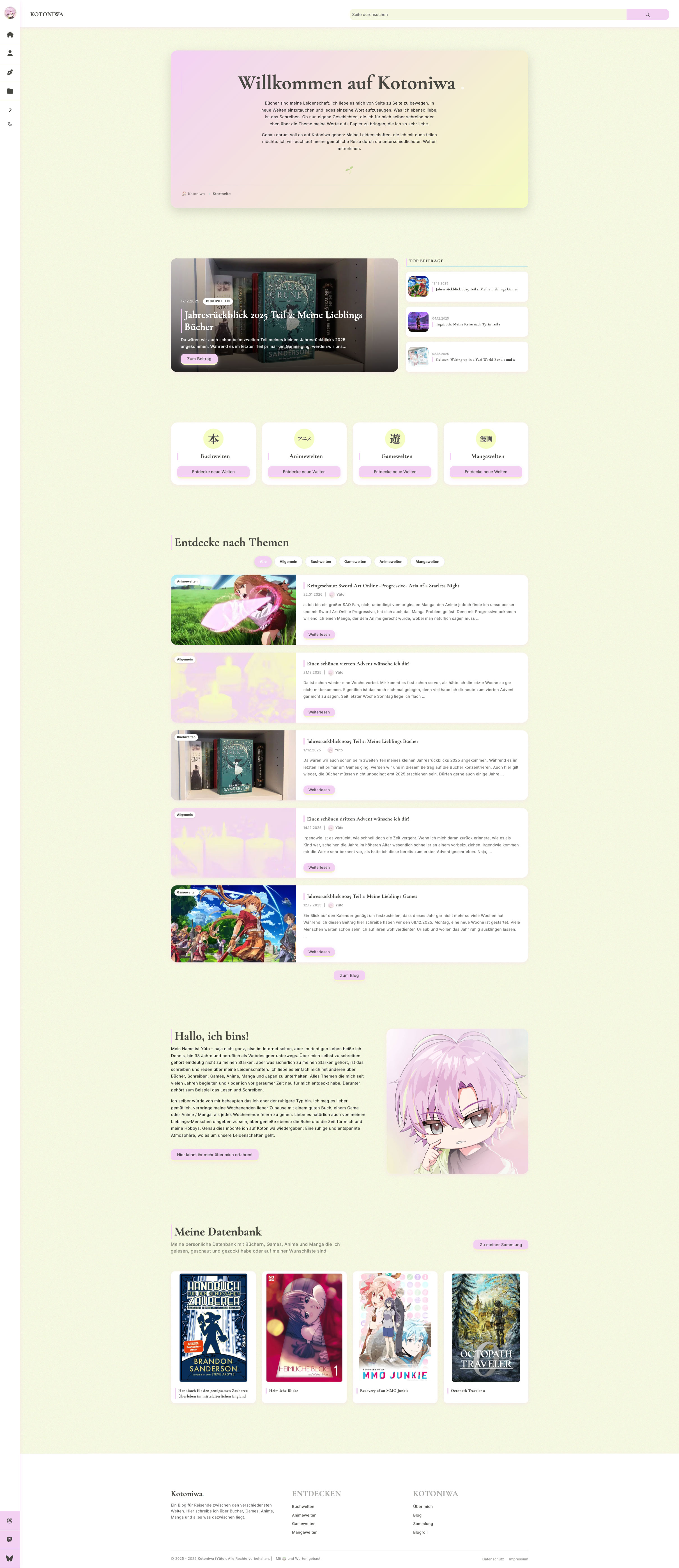 Kotoniwa ist ein Blog, welcher sich mit popkulturellen Themen wie Bücher, Gaming, Anime und Manga befasst. Empfehlungen, Bewertungen und Meinungen zu den liebsten Themen des Autors sind hier zu finden.